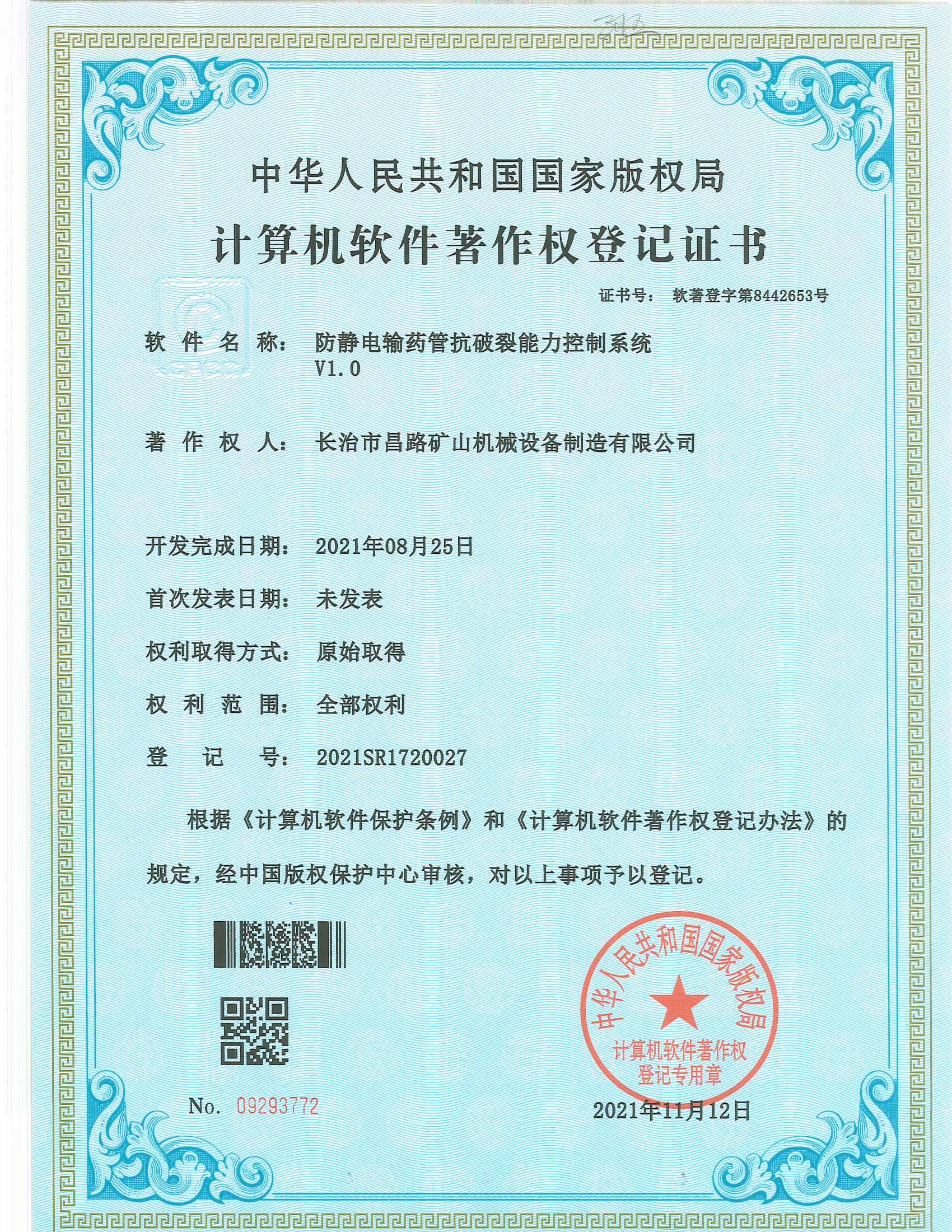 防靜電輸藥管搞破裂能力控制系統(tǒng)著作權(quán)登記證書